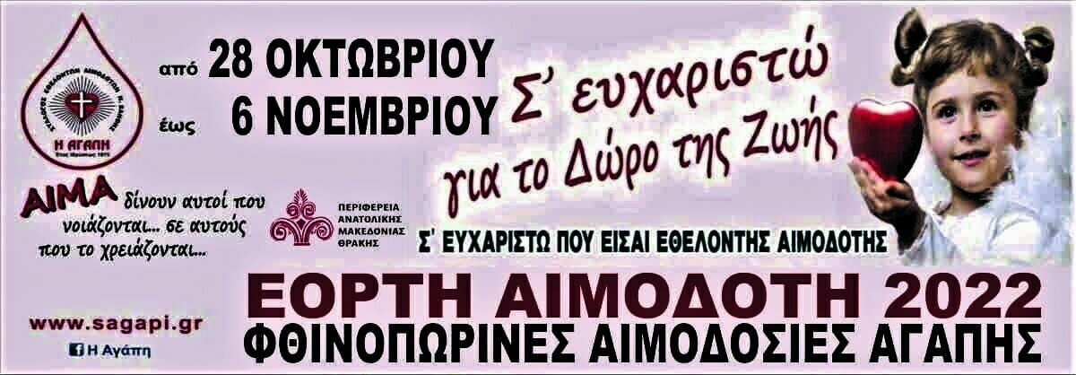 Το Δ.Σ. του Συλλόγου Εθελοντών Αιμοδοτών Ν. Ξάνθης «Η ΑΓΑΠΗ» ενημερώνει ότι ξεκινάνε από την Παρασκευή 28 Οκτωβρίου έως και την Κυριακή 6 Νοεμβρίου οι ΦΘΙΝΟΠΩΡΙΝΕΣ ΑΙΜΟΔΟΣΙΕΣ ΑΓΑΠΗΣ 2022 σε συνεργασία με την κινητή μονάδα αιμοδοσίας του Νοσοκομείου Παίδων «Η ΑΓΙΑ ΣΟΦΙΑ».