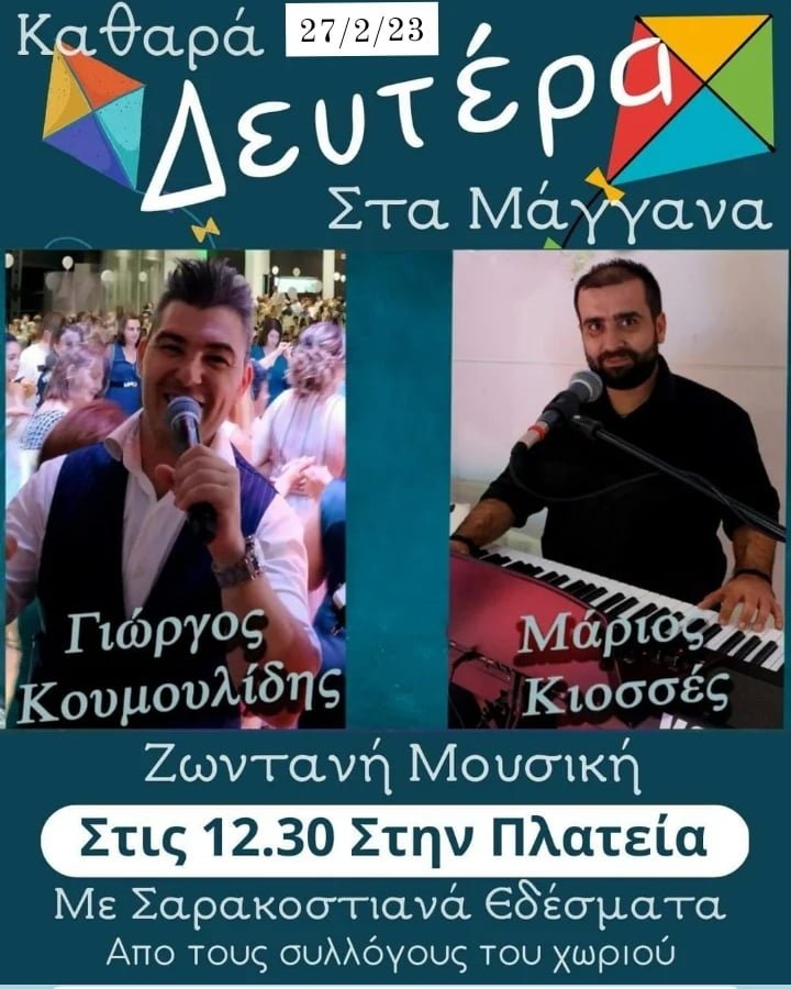 Την Καθαρά Δευτέρα 27 Φεβρουαρίου 23, στις 12:30¨ (στην πλατεία του χωριού), να διασκεδάσετε στο μοναδικό σαρακοστιανό γλέντι (με LIVE πρόγραμμα του Γιώργου Κουμουλίδη), στα Μάγγανα του Δήμου Τοπείρου, με δωρεάν κρασί, σαρακοστιανά εδέσματα, λαγάνα, φασολάδα και άλλα πολλά τα οποία προετοιμάζονται από τους Συλλόγους του χωριού μας, σε συνδυασμό με το καθιερωμένο πέταγμα του χαρταετού σας, ξεκινώντας έτσι, τη Μεγάλη Σαρακοστή…!!!