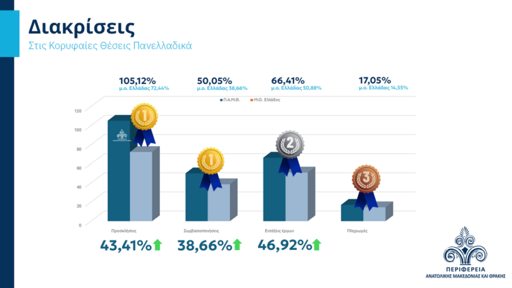 - 1η Περιφέρεια σε εντάξεις έργων με δικαιούχους Δήμους της ΠΑΜΘ στα Περιφερειακά έργα ΕΣΠΑ 2021-2027(επίτευξη 19,02% vs Μ.Ο. 10%), σύμφωνα με μελέτη του Ινστιτούτου Τοπικής Αυτοδιοίκησης (ΙΤΑ).