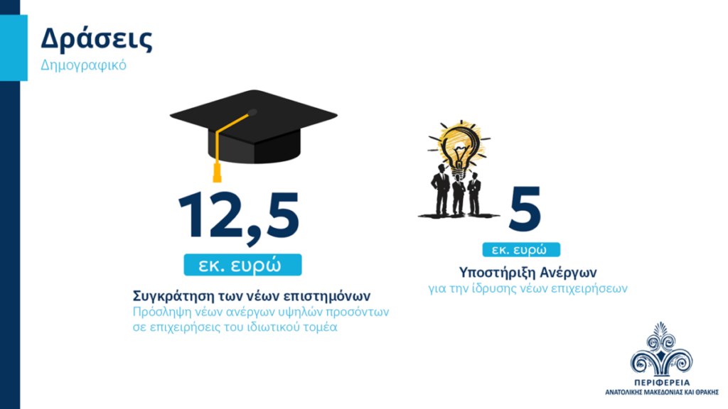 - Με συγκράτηση των νέων επιστημόνων, με δράση πρόσληψης νέων ανέργων υψηλών προσόντων σε επιχειρήσεις του ιδιωτικού τομέα, προϋπολογισμού 12.5 εκατ. ευρώ.