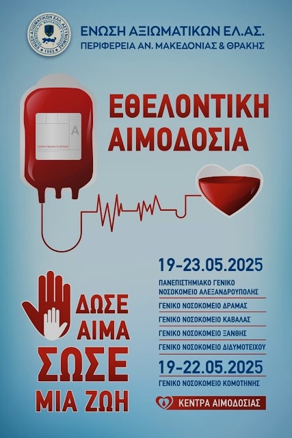 Γνωρίζεται ότι η Ένωση Αξιωματικών ΕΛ.ΑΣ. Ανατολικής Μακεδονίας – Θράκης διοργανώνει σε έξι (6) πόλεις της Περιφέρειάς μας, εθελοντική αιμοδοσία για τις ανάγκες της Τράπεζας Αίματος της Ελληνικής Αστυνομίας.