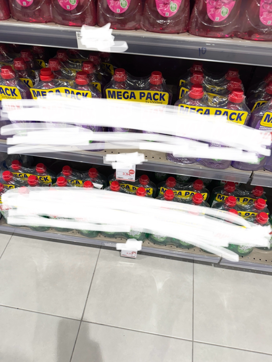 Περπατώντας μέσα στο σούπερ μάρκετ και φθάνοντας σε άλλο ράφι όπου εκεί υπήρχαν όλα τα απορρυπαντικά πατώματος (και άλλες μάρκες) διαπίστωσα πως το ίδιο ακριβώς απορρυπαντικό σε μονή συσκευασία, ίδιο άρωμα και ίδια ποσότητα είχε 1,85 ευρώ, πράγμα που σημαίνει πως ήταν φθηνότερο από αυτό της υποτιθέμενης προσφοράς κατά 0,12 λεπτά του ευρώ.