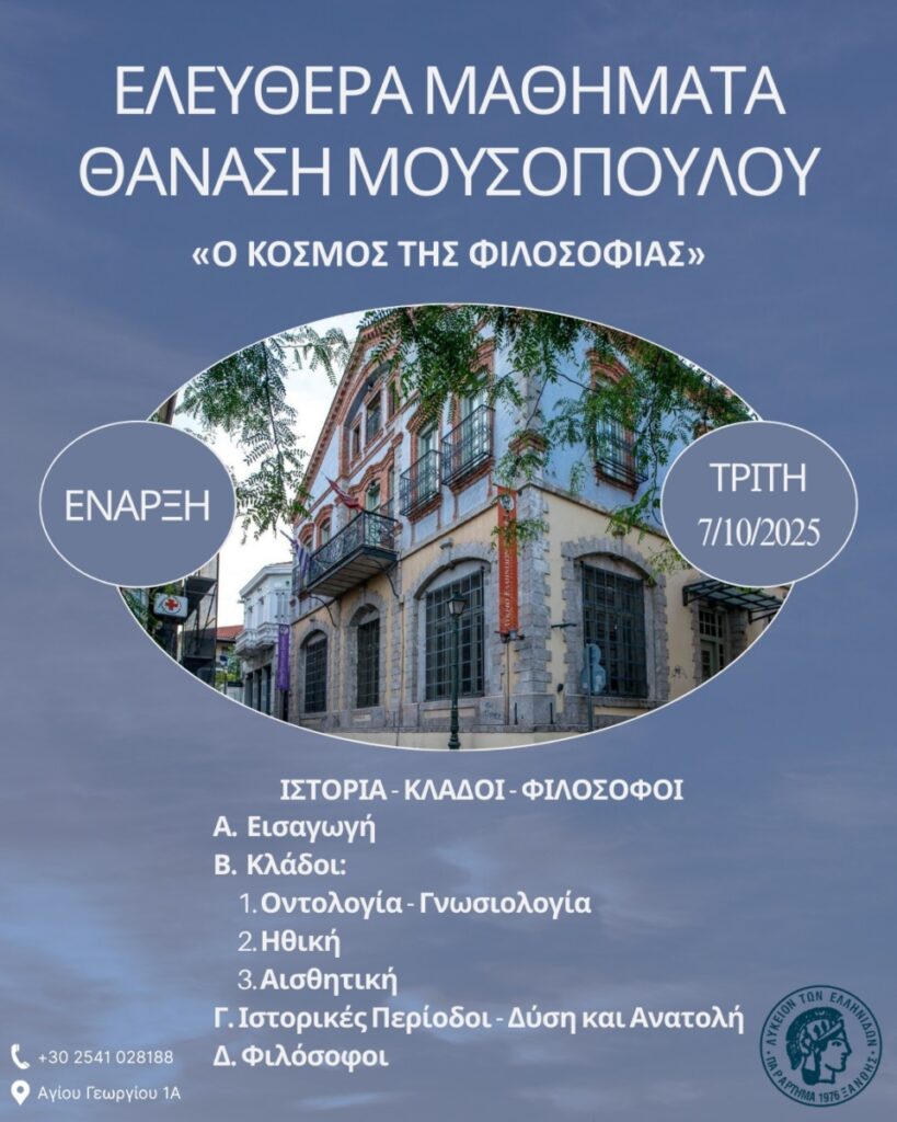 Με έναν νέο κύκλο ελεύθερων μαθημάτων φιλοσοφίας επιστρέφει για το ακαδημαϊκό έτος 2025-2026 ο Θανάσης Μουσόπουλος, φιλόλογος, συγγραφέας και γνωστός για το πολυσχιδές πνευματικό του έργο. Τα μαθήματα, που φέρουν τον γενικό τίτλο «Ο Κόσμος της Φιλοσοφίας», απευθύνονται σε κάθε ενδιαφερόμενο, ανεξαρτήτως ηλικίας ή προηγούμενης ενασχόλησης με τη φιλοσοφία.