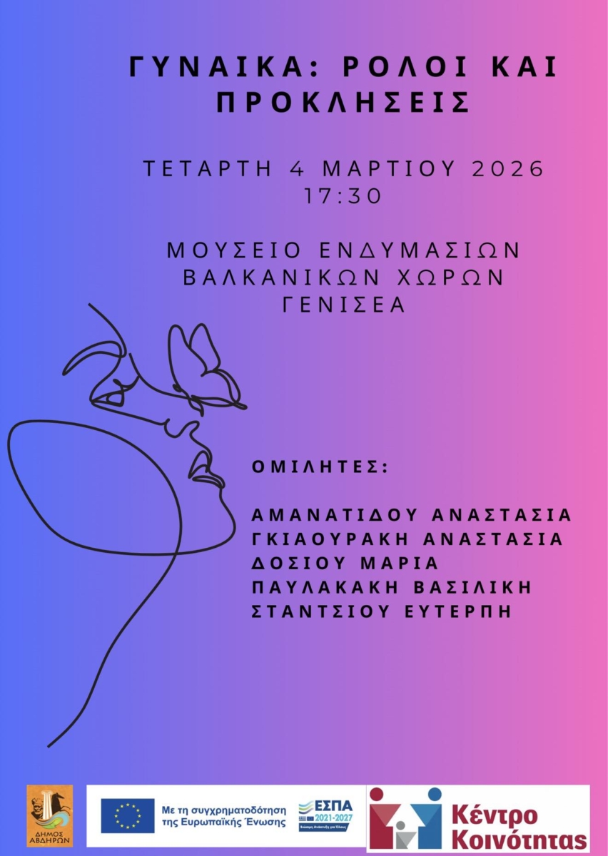 Με επιτυχία αναμένεται να πραγματοποιηθεί η εκδήλωση με τίτλο «Γυναίκα: Ρόλοι και Προκλήσεις», την Τετάρτη 4 Μαρτίου 2026 και ώρα 17:30, στο Μουσείο Ενδυμασιών Βαλκανικών Χωρών στη Γενισέα.