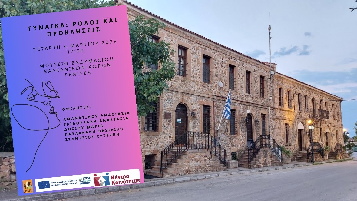 Με επιτυχία αναμένεται να πραγματοποιηθεί η εκδήλωση με τίτλο «Γυναίκα: Ρόλοι και Προκλήσεις», την Τετάρτη 4 Μαρτίου 2026 και ώρα 17:30, στο Μουσείο Ενδυμασιών Βαλκανικών Χωρών στη Γενισέα.