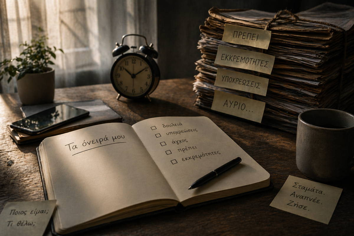 Δεν πρόκειται μόνο για μια ατομική εμπειρία. Είναι μια συλλογική πραγματικότητα. Άνθρωποι που γεμίζουν τη μέρα τους μέχρι το τελευταίο λεπτό, αλλά δυσκολεύονται να πουν αν αυτό που ζουν τους εκφράζει πραγματικά. Που μετρούν την αξία τους με βάση το πόσα προλαβαίνουν, όχι με το πώς νιώθουν όσο ζουν.